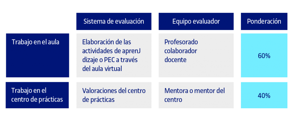 - las valoraciones del centro de prácticas en las que el mentor o mentora del centro evalúa el trabajo hecho por el estudiantado por medio de sus herramientas de evaluación diseñadas por el responsable de la asignatura y de acuerdo con los criterios de evaluación, y elabora el informe de evaluación final.