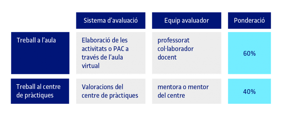 La qualificació de l’assignatura és el resultat de les activitats que l’estudiantat porta a terme a l’aula virtual i al centre de pràctiques.